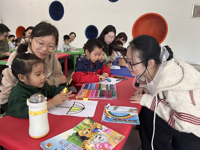 金美岐老师则带领亲子走进《章鱼先生卖雨伞》故事世界,章鱼先生为动物们定制专属雨伞的情节,让孩子们沉醉不已。家长们轻声伴读、模仿角色对话,温馨氛围将每一组家庭紧紧包裹。创意手工时光里,亲子合作设计专属雨伞,彩虹、动物等趣味图案跃然伞面,在协作中迸发创造力,也让亲子默契悄然升温。家长们由衷感慨:“放下手机的专注陪伴,才是最珍贵的时光!”